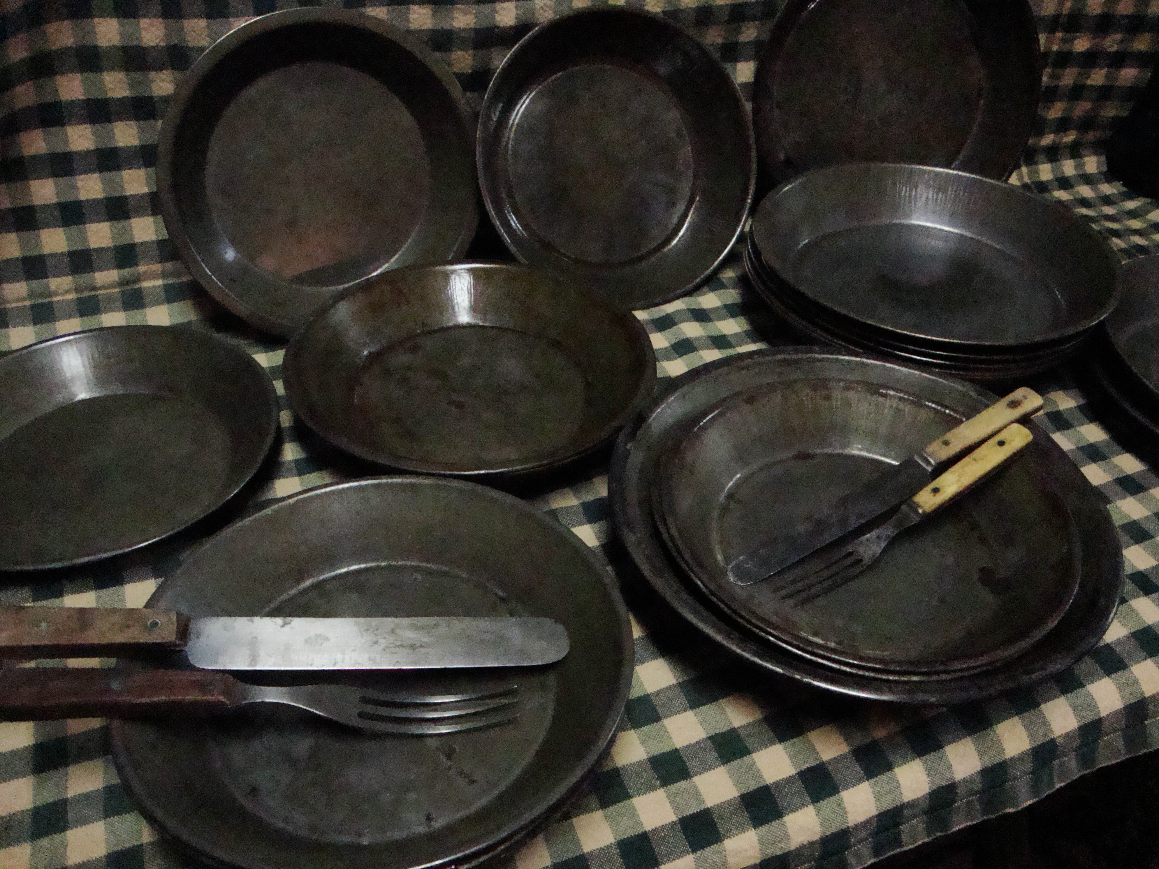 We are more than buttons! Visit us for a huge selection of one of a kind vintage tinware including these original 7" & 8" tin plates value priced at just $6.00 each.