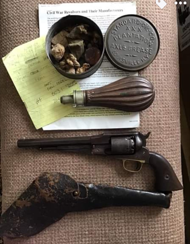 After a few minutes, she hands me a bag, that contained this. It is an April 1863 manufactured (sn 200xx) Remington New Model Army, in a Confederate manufactured holster. Carved in bottom of a grip is MW for Micajah Wilkinson. After a few minutes of talking, she says, “Take it back to Mississippi with you”