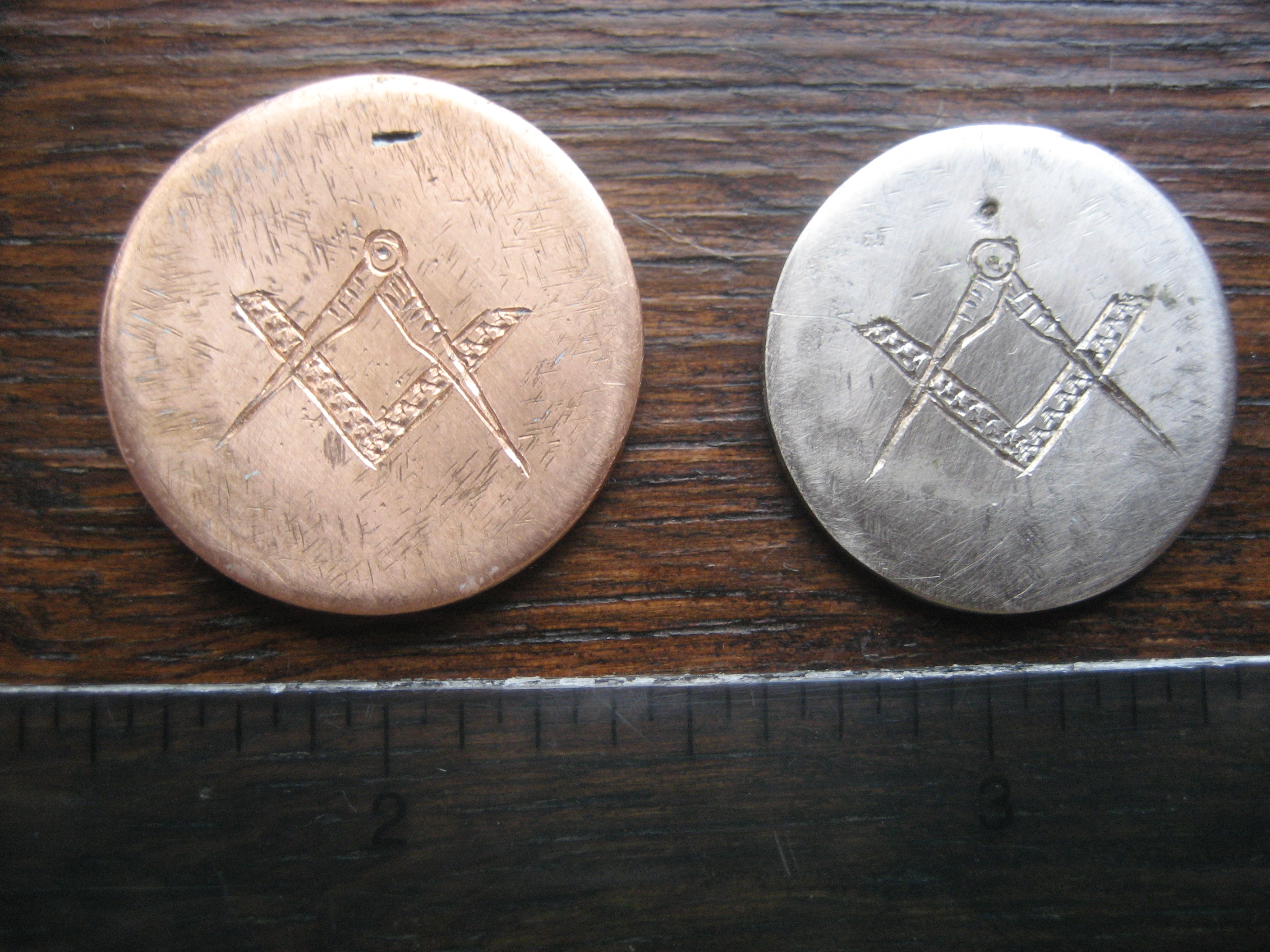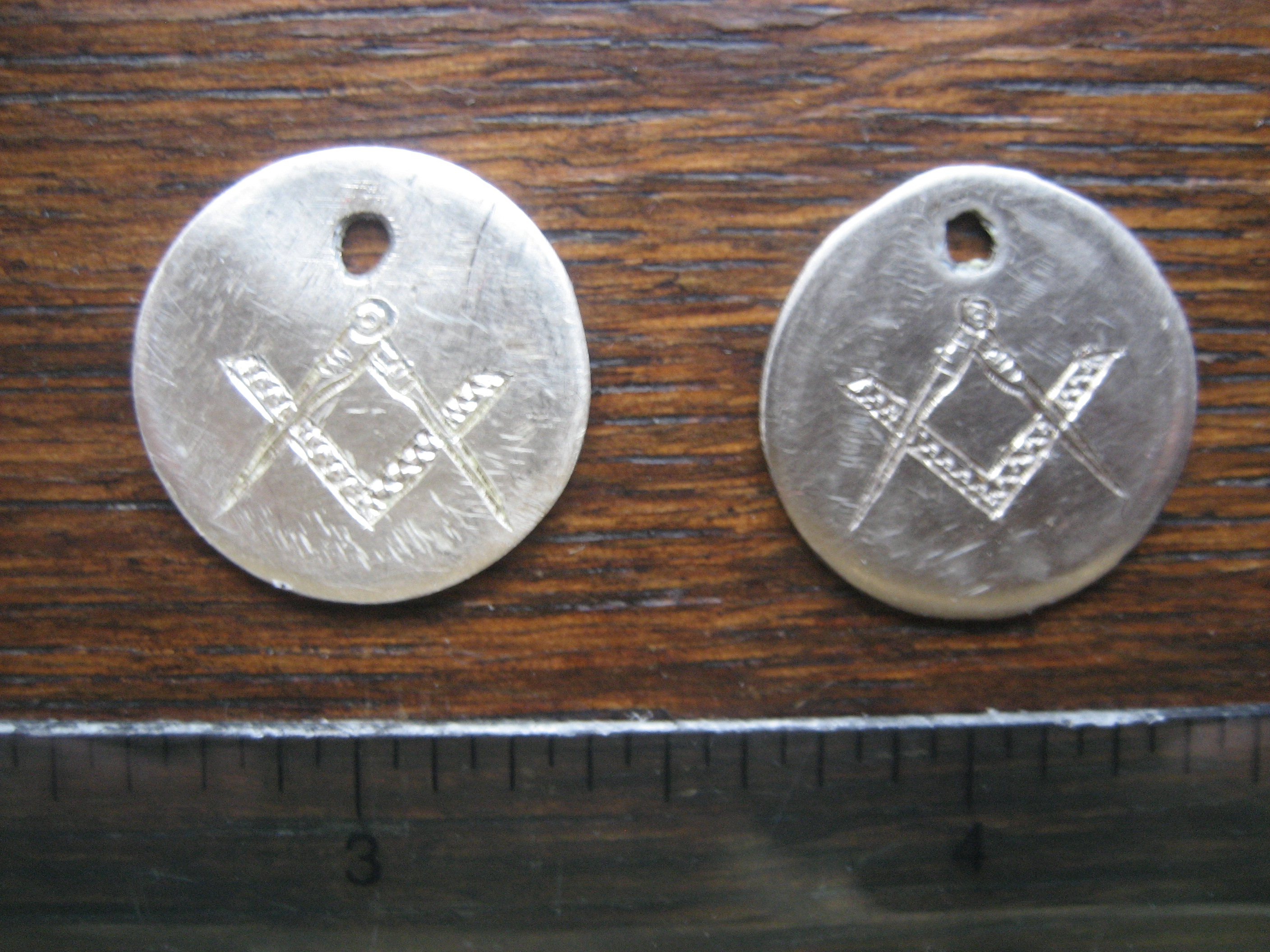 Here is a VERY limited run of FOUR period coins with hand engraved Square and Compasses on the reverse side.
