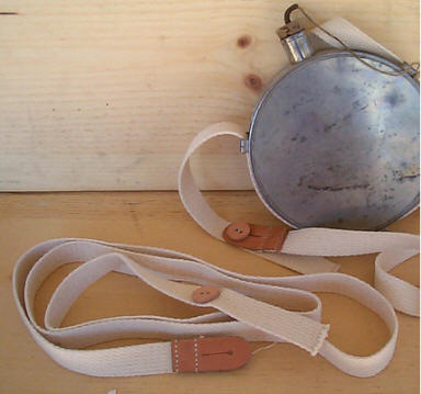 Replacing the tin drum type canteen. The regulation canteen for the Federal Army just previous to the war became the Model 1858 Tin oblate spheroid canteen. This is the regulation canteen sling that was first issued with this canteen. Made of russet oiled leather5/8” wide and 72” long with a thing gauge iron roller buckle, hand sewn with leather keeper and a “chape” or “safe” sewn behind it………………………………………..$30