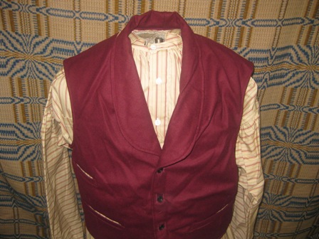 Maroon wool vest with tan and red stripe printed back. 4 Small japaned tin buttons, size 44. $65.00