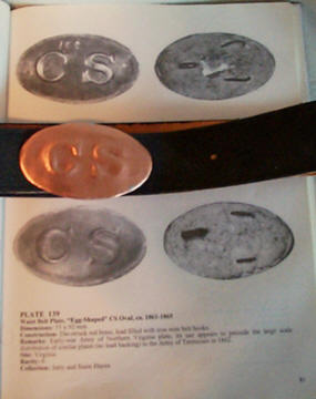 1 CSB9 Confederate Iron Dyed Leather Waist Belt with Hand stamped Copper CS Egg Plate. (1861-65)Typical CS Leather belt encountered by collectors, Belt has wide spaced adjustment holes and is Iron Dyed. Can be made either smooth side or flesh side out............................. $60