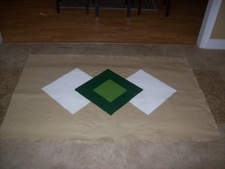 Painted cloth floorcloth. Couldn't come up with a clever name for this one other than it looks like a pair of argyle socks I used to have. Tan background, green and white diamonds in the center. Dimensions are 48" x 70". $80
