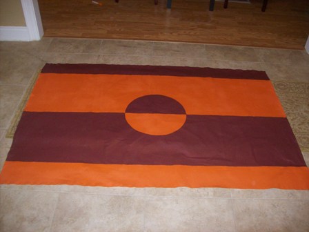 Painted cloth floorcloth titled "Hokie." A nice pickup for a Virginia Tech fan. Burgundy and orange contrasting pattern. Dimensions are 48" x 71". $80