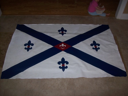 Painted cloth floorcloth titled "Polignac's Pride & Joy." Blue St. Andrew's cross on white background. Blue fleur de lis in the white fields, white fleur de lis in red intersection of blue lines (sounds confusing, but its not). Dimensions are 48" x 71". $95.00