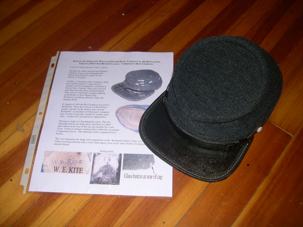 With pleasure I am able to offer another "clone" kepi. This is an 1864 cap Id'd to a Virginia cavalryman named William Kite. It is classic Richmond Depot style.