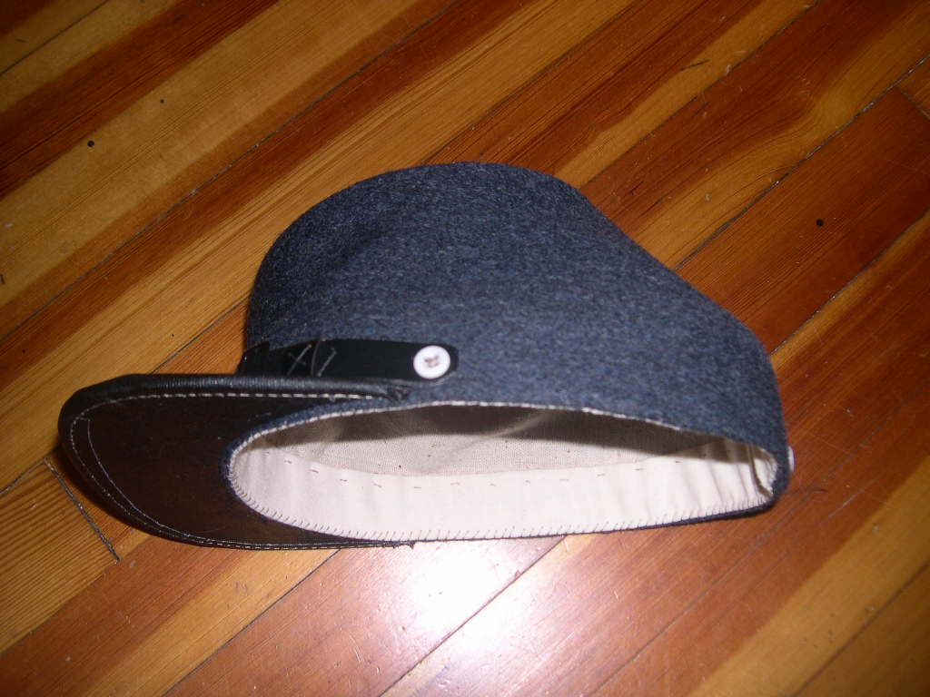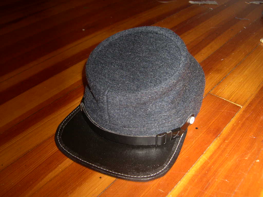 The kepi is made of a fine blue/gray satinet wool. The two chinstrap buttons are white glass, and there is a third glass button at the rear of the cap, presumably for a rain cover. Lining is natural osnaberg fabric while the sweatband is unpainted canvas. The leather chinstrap uses a japanned iron buckle which has been faithfully reproduced.