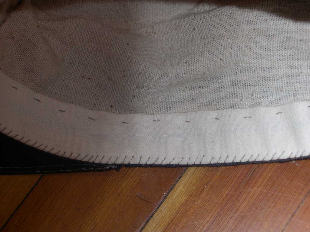 The visor maintains the shape and composition of the “Richmond Depot” kepi; it is made of tarred cloth covered pasteboard with a wide cloth edging sewn on by wide stitches of undyed (white-natural) thread.