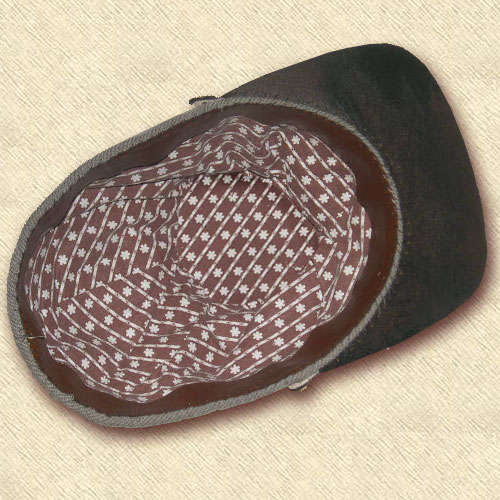 This reproduction of the Williamson cap is made of Ben Tart Sumac jean, which will fade in sunlight to a color amazingly close to the original. A key feature of the cap is the lining. This lining has been carefully reproduced exactly as seen in the original. This custom lining is exclusive to this project. The original shows remnants of sewing indicating a sweatband and a chinstrap. It is unknown what those were. A brown leather sweatband has been used and a chinstrap added. Available buttons are reproduction North Carolina state seals, eagles, or coin.
