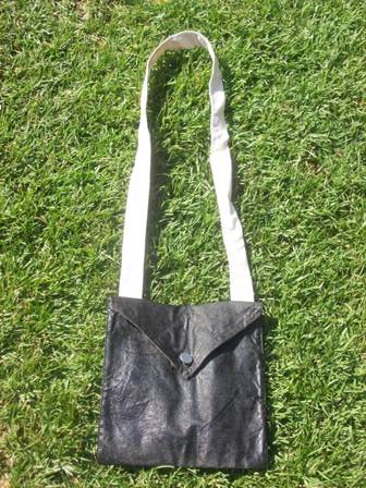 Additionally, we have two of the painted cloth version of this haversack in stock. All of the same specs as above, only utilizing a pewter button and a painted cloth bag with natural cotton strap. Price is $35 plus shipping. BOTH ON HOLD