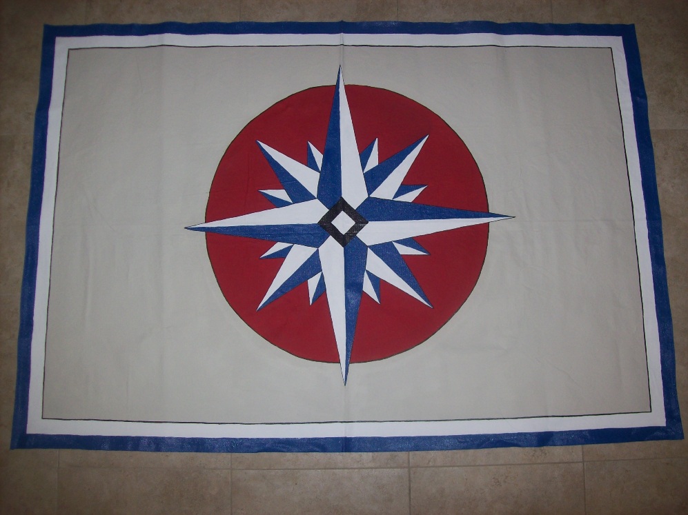 The first floorcloth is the “Compass Rose” design commonly referred to as a mariner’s compass. This floorcloth is approximately 4’ x 6’ with hemmed edges and is ready to ship. Photos are attached. Price is $95 plus shipping. ON HOLD.