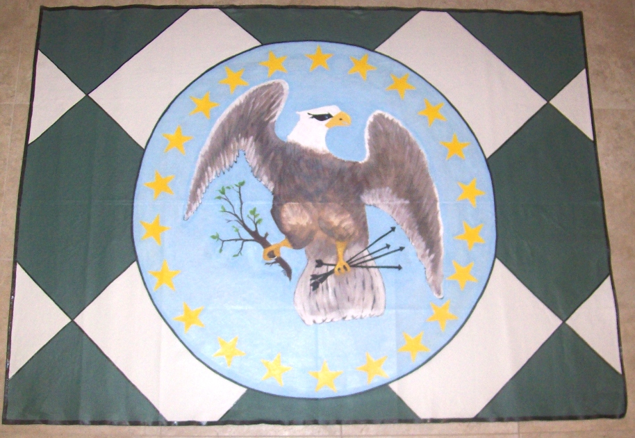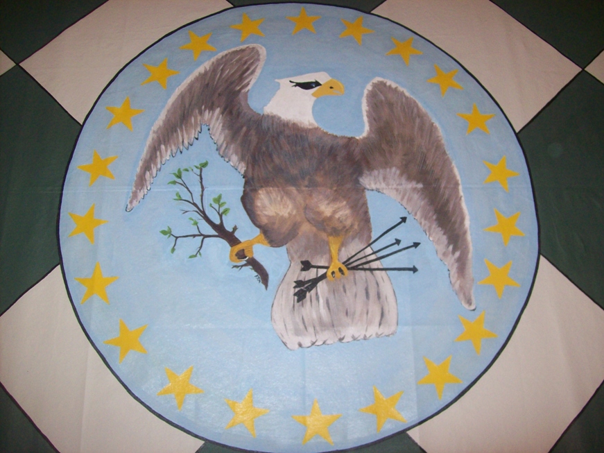 Yes, the eagle has landed.... on a nice green and cream colored harlequin pattern floorcloth.