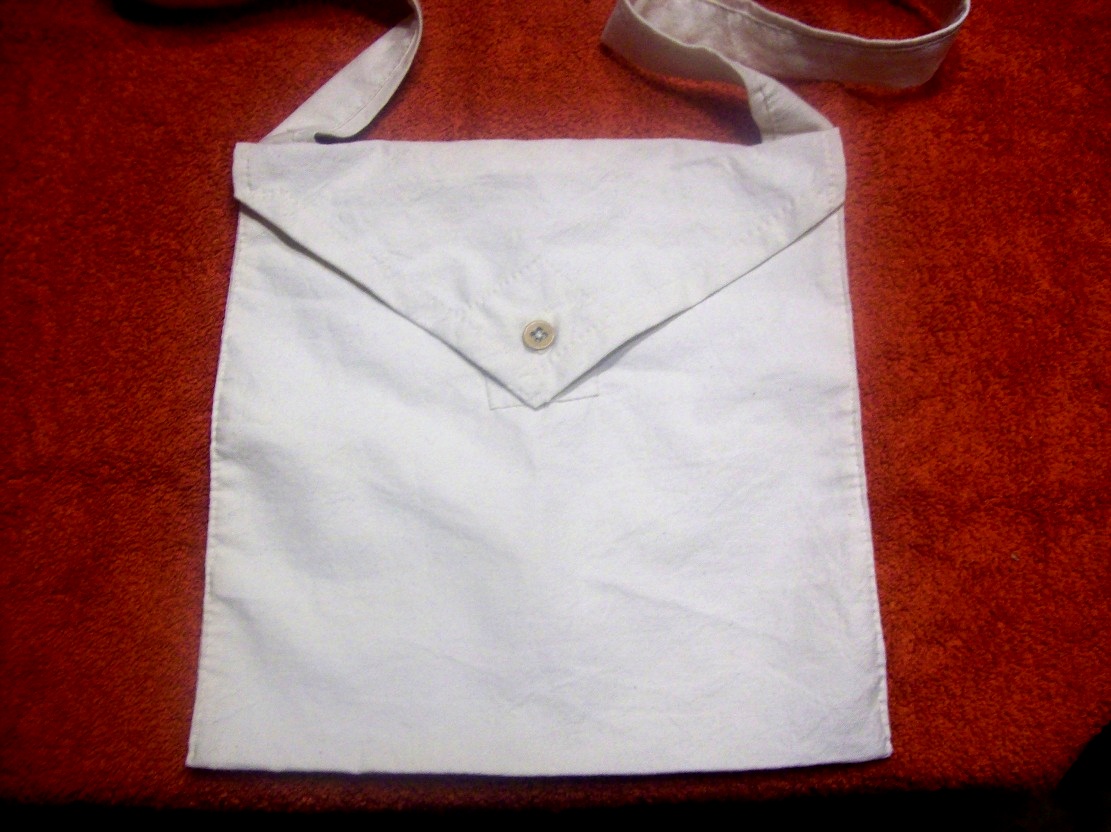 1 CS Moses Alexander haversack. Entirely handsewn out of a cotton drill. Bone button closure. $30.