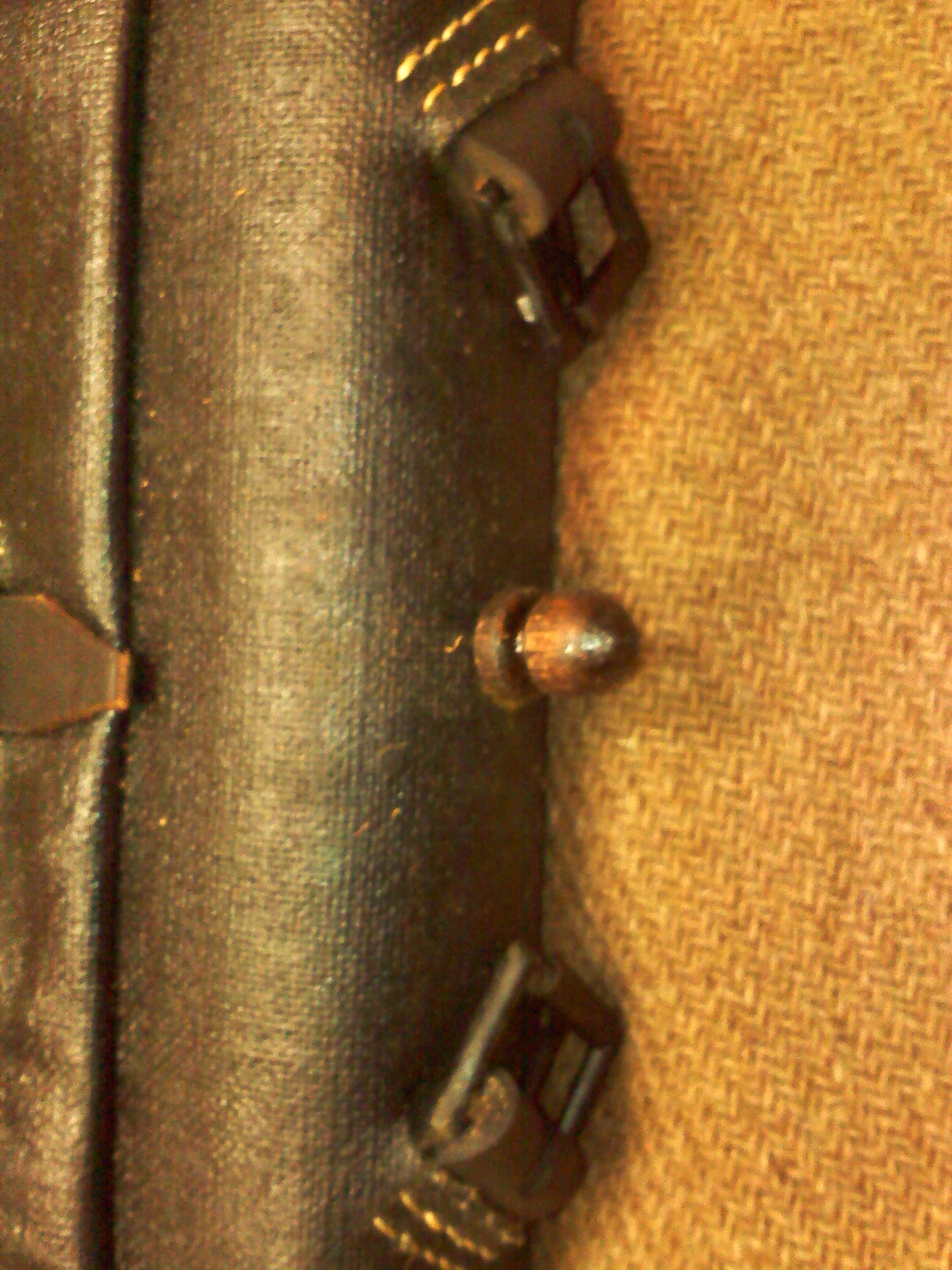 1 - Bayonet scabbard with Painted cloth frog. Scabbard is made of iron dyed/cod oiled leather and the frog is painted cloth. Scabbard has a tin tip with a lead plug.