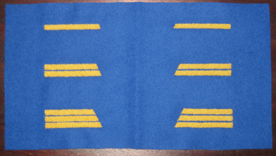 Each order will consist of a 6” x 11” piece of wool with a pair of 2nd Lt., 1st Lt and Captains bars applied to it! (See Photo below) Thats right, you will receive ALL THREE line officer ranks with your order! This is perfect for those who may not hold the same rank from event to event. Or, if you are part of a standing company, one set will cover the needs for the entire company command.