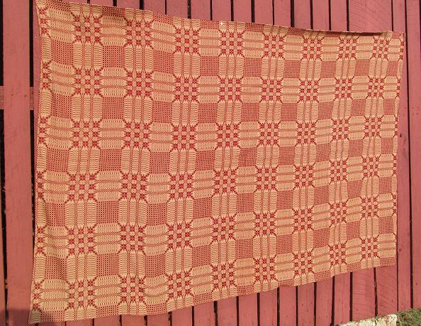 Our newest offering in the coverlet line is now available!! Made of wool from an east coast U.S.farm and cotton. This coverlet is in the Tennessee Blazing Star pattern, in brick red with tan background. Limited quantities are available, so don't miss this chance to own a piece of history! Measures approximately 83x51. Great addition to your impression!! $129.00 plus shipping.