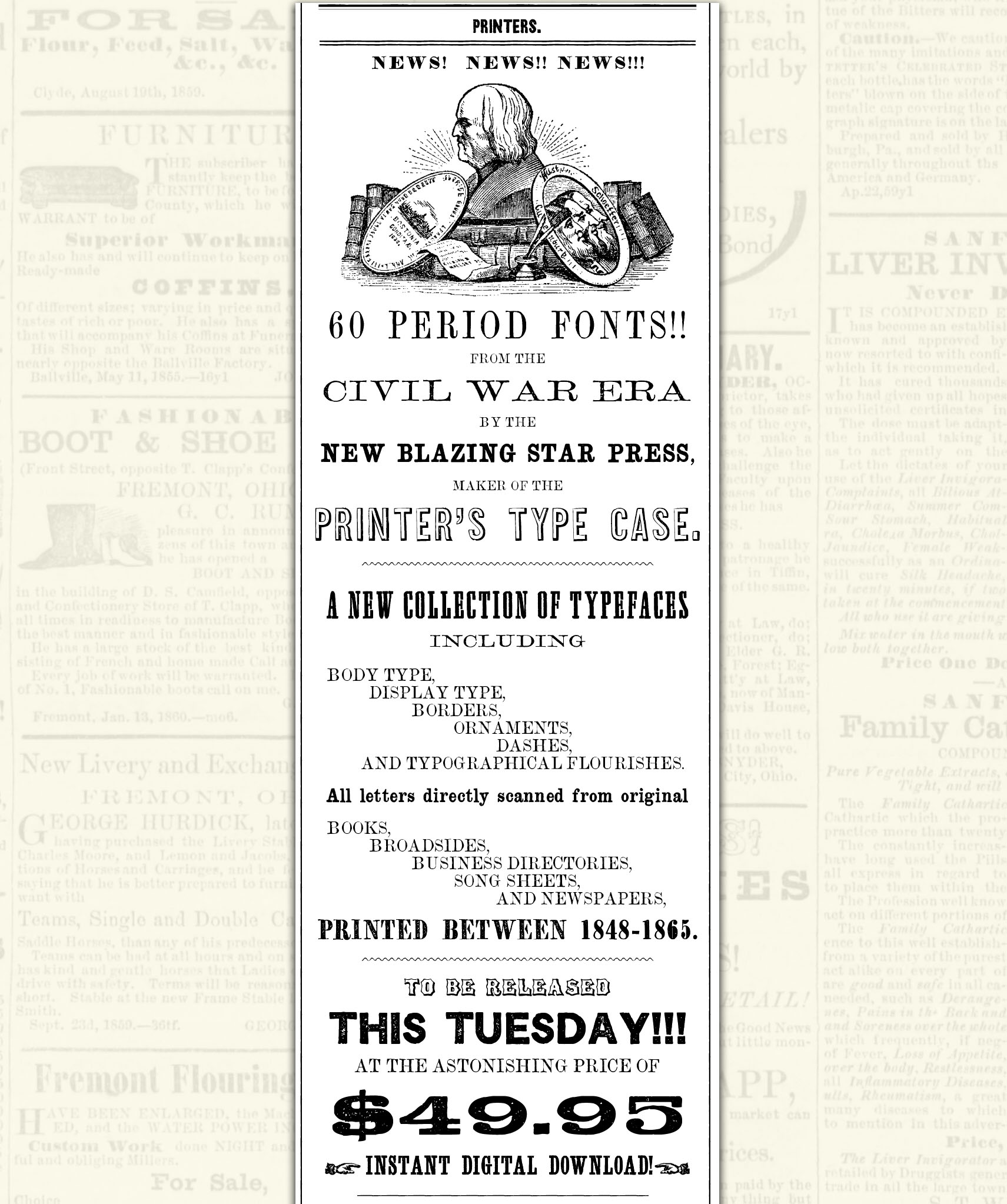 Celebrate Michaelmas this Tuesday, September 25, with the official launch of the New Blazing Star Press' website and the release of the first volume of the Printer's Type Case, containing 60 Civil War fonts revived from original books and documents!