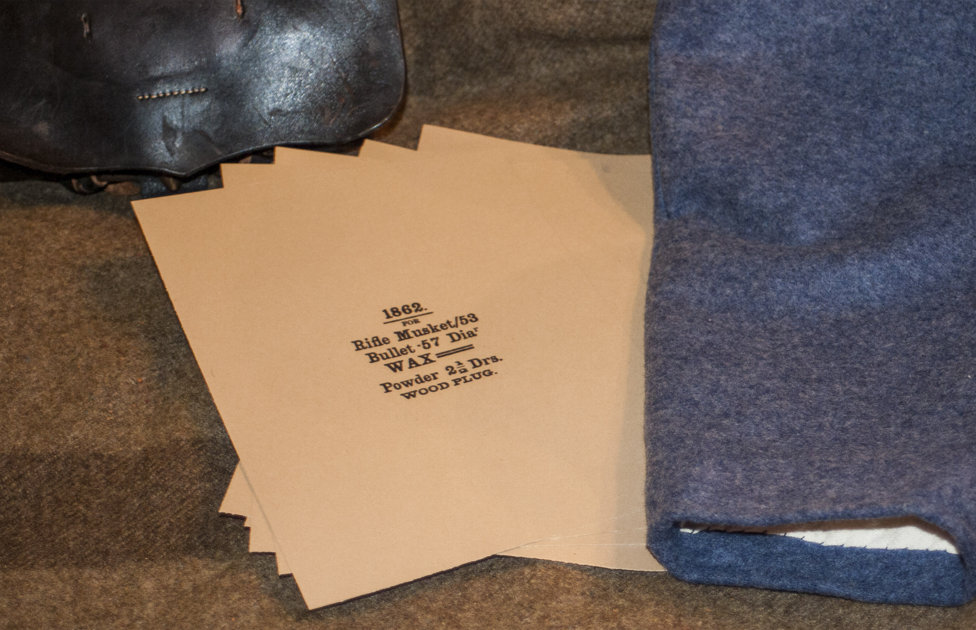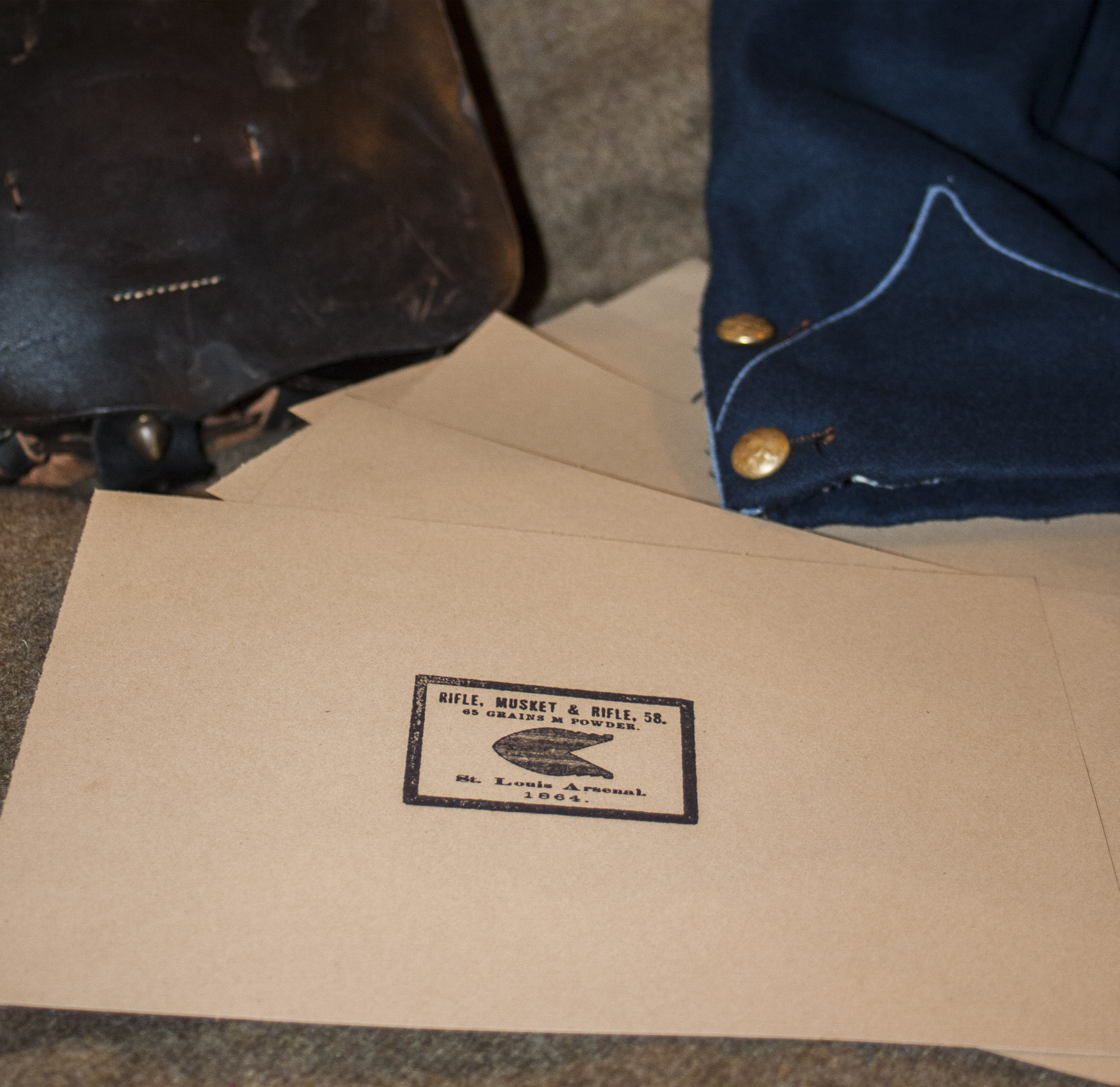 Each includes six brown paper wrappers cut to 9" x 6 1/2", either stamped with a St. Louis Arsenal or Enfield stamping, or come with six Macon Arsenal or Charleston Arsenal labels reprinted using the exact typefaces as the originals.