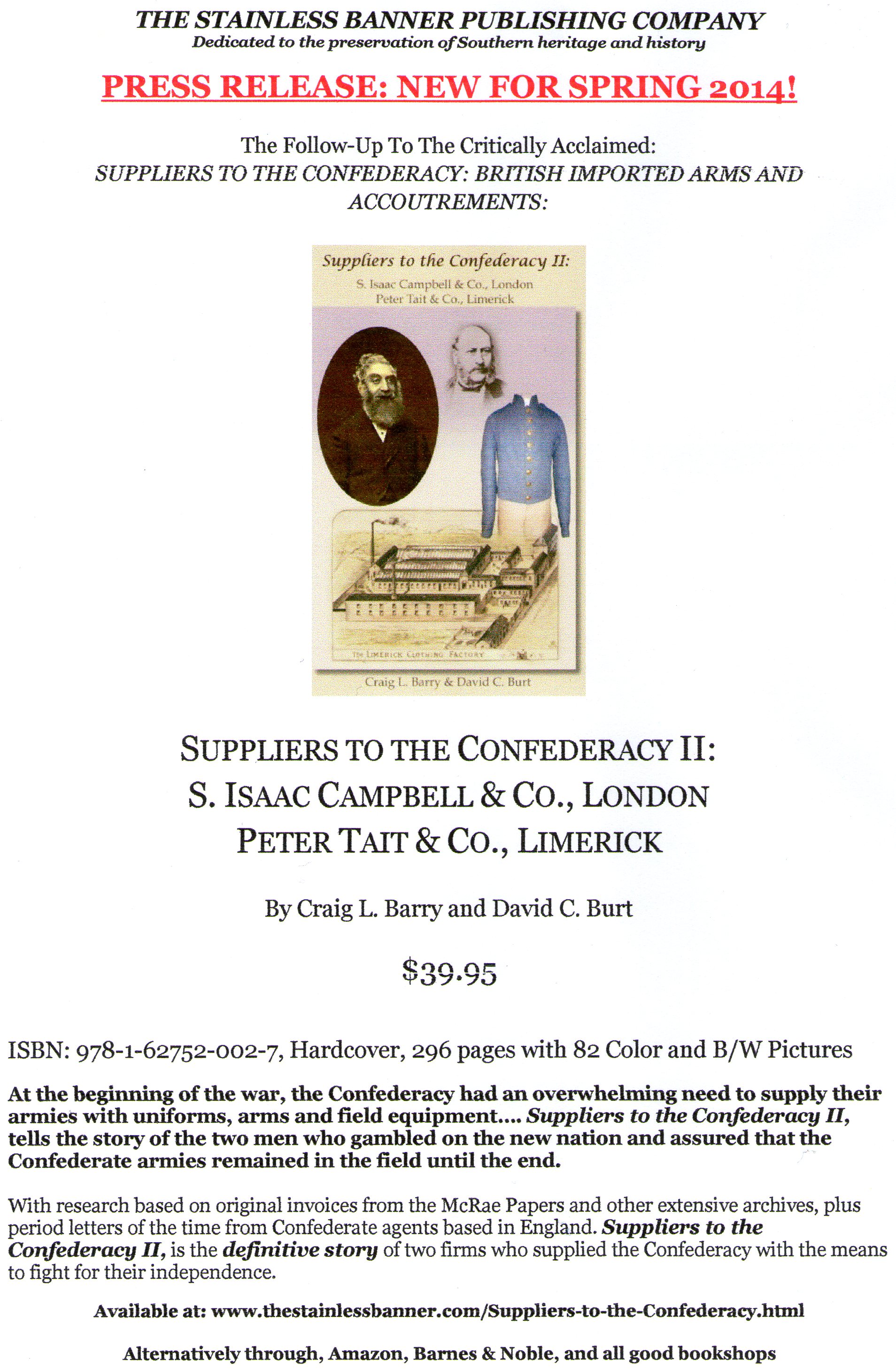 STAINLESS BANNER PUBLISHING of Fairfield, Ohio, are pleased to announce that Suppliers to the Confederacy: S. Isaac Campbell & Co, London / Peter Tait & Co, Limerick, will be released on March 15, 2014. See http://www.thestainlessbanner.com/Su...nfederacy.html for 15% discount on early book orders.