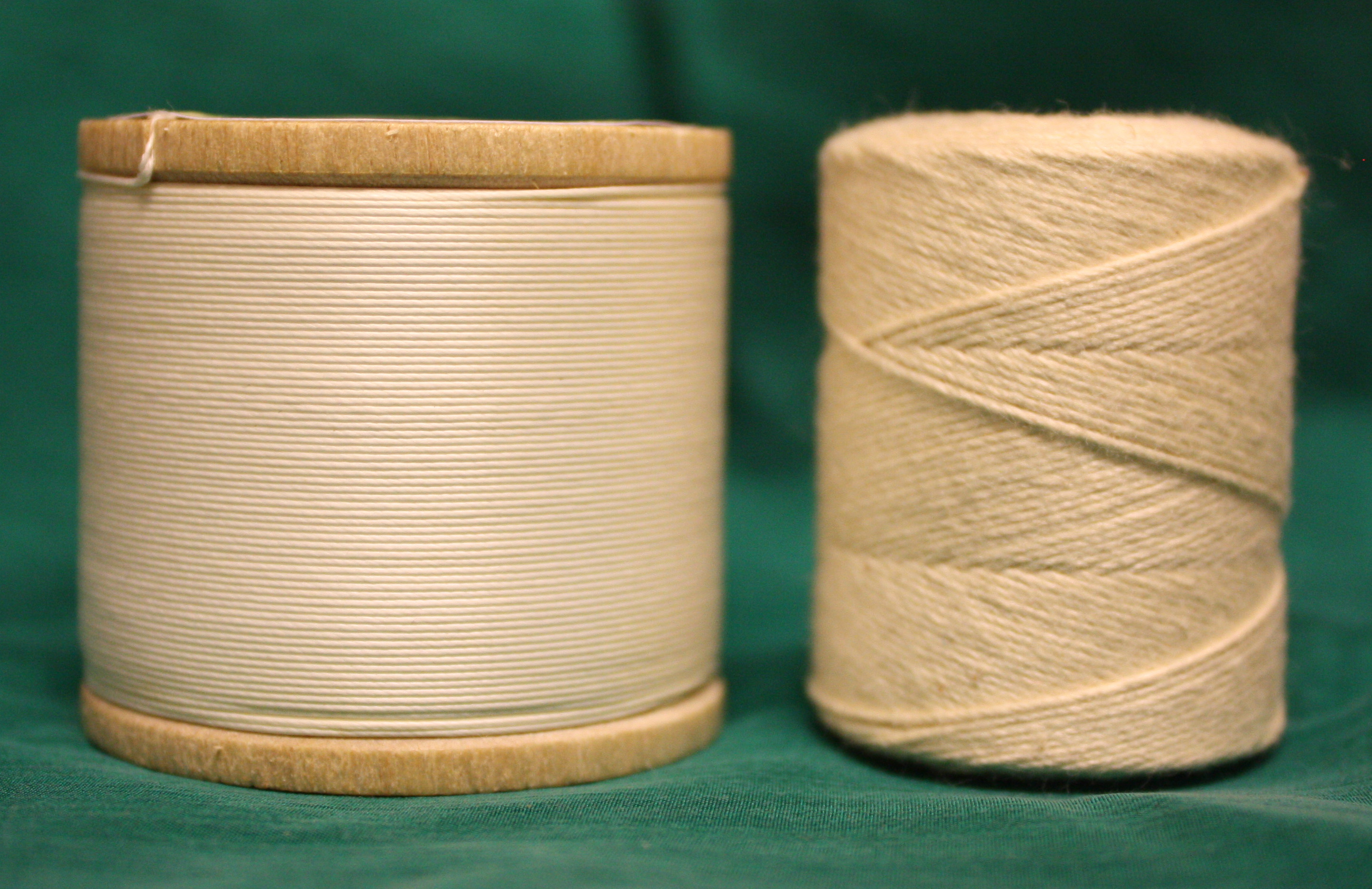 We are pleased to announce that we are now able to offer "Dead Stock" cotton thread. This is listed as size 30 (0.45mm) produced in 1952. This is uncoated, unmercerized thread that is ideal for top-stitching or buttonholes. It is much more supple than "Button Thread" or Linen so it will lay flatter and look better. Available in 100 yard spools, white only. Pictured here with our coarser cotton thread, ideal for stitching leather.
