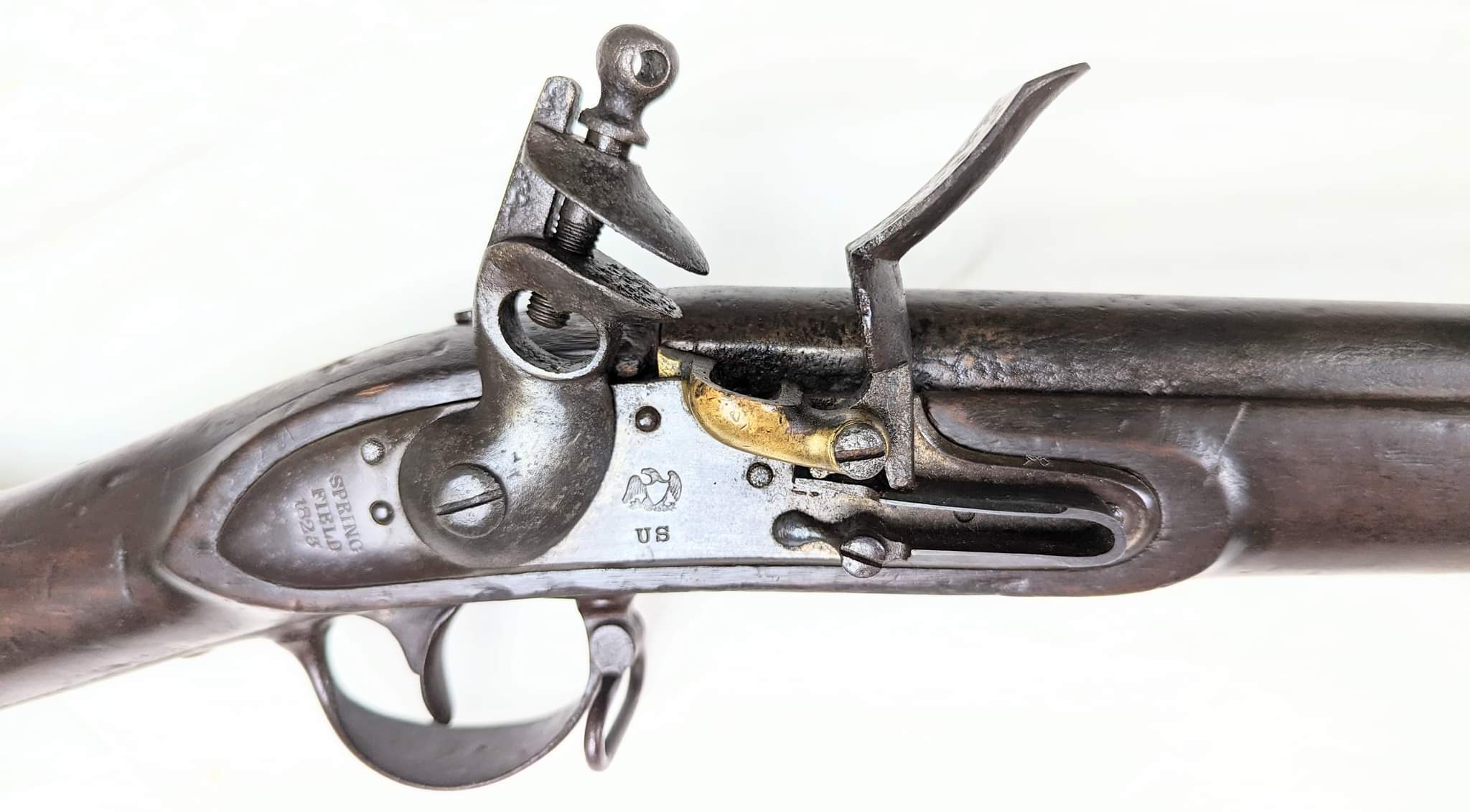 Originally in flintlock configuration but was converted to percussion later in life, and since reconverted back to flintlock. It is mechanically fine and functional. The bore is dark and would benefit from a good cleaning (or relining for an optimal shooter). The lock is dated 1823 Springfield but there is no mark on the barrel tang. There are some stock cartouches as well. The stock is in good condition for the age, without any major cracking sometimes seen on original musket stocks. The VP Eagle is mostly worn, but there are remnants of those stamps remaining.