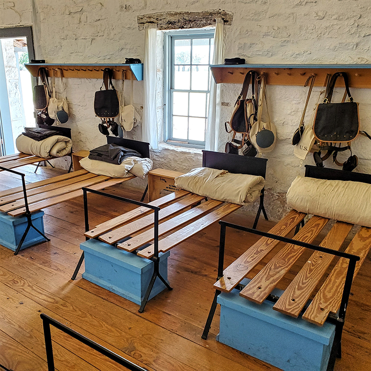"Right now our big project that we are working on is completing the furnishings in Barracks #4. This barracks was completed by Co. B, 8th Infantry in early 1853 and was used during the antebellum, Civil War POW camp period, and postbellum eras of the fort. We have set the southern room and NCO quarters up as it would have been during the antebellum period, the middle room as it would have been ca. 1874, and the north room we are going to revert back to commissary storage as it was throughout all periods of use."