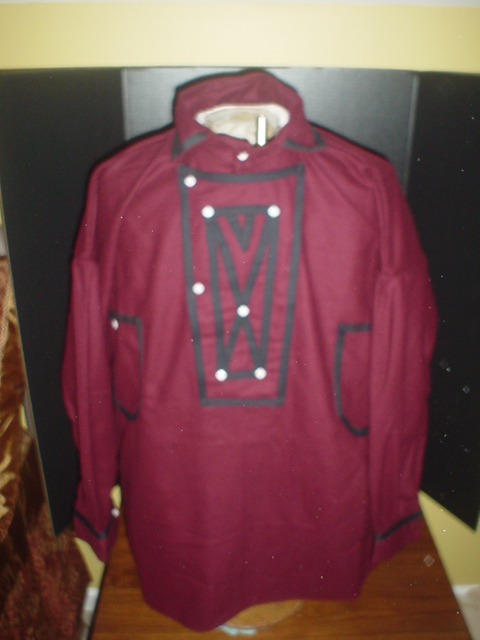 4. California Miner's overshirt, maroon wool flannel with black tape trim and white glass china buttons. Awesome looking shirt, size "L" that will fit up to 46. $125