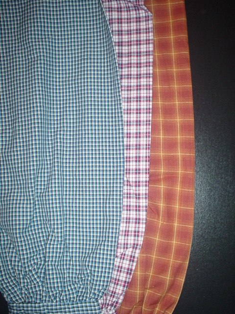 7. Also pictured are the new colors and patterns of shirtings that are being offered. These are sized 42 through approx. 48 and are made with full "bloused" type sleeve. Half lined with cotton muslin. $75