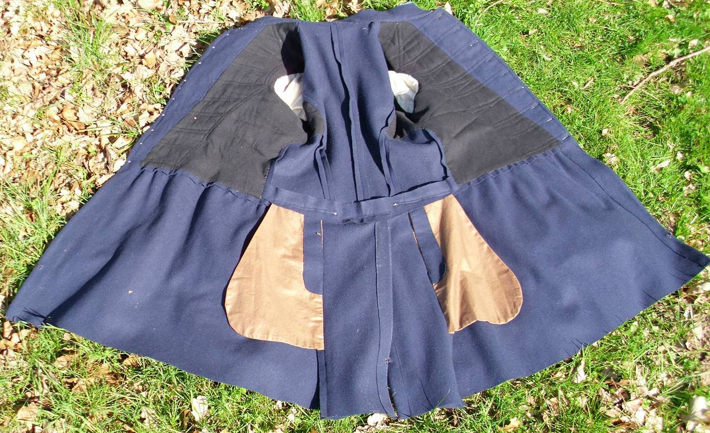 The breast is padded, stiffened and quilted. The workmanship is pretty nice. The sewing is well done and is mostly machine sewing but also a considerable amount of hand sewing. Some stitches on the breast brais wander however but that is consistent with period examples. Wade has used an excellent broadcloth for the frock coat, W.W. &Co wool lining and Needle and Thread piping and braiding.