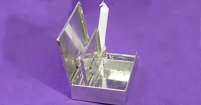 - The end of the safe drops down so the candle is vertical and the outer lid is a partial reflector.