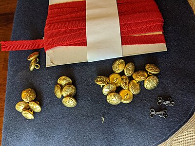 #2 Brand new federal artillery kit made by me, cut using a Charlie Childs pattern and high quality broadcloth from one of the Rev War sites. Comes with generic made eagle buttons for front, collar and cuff. I will include 2 extra buttons and logwood thread. This is for a size 46 long that I never got around to making. This also features some hard to find jean for the lining which can be quilted if you use a woolen batting and linen backing. Please do not buy this if you don't have any experience sewing. Asking $130 + S&H.