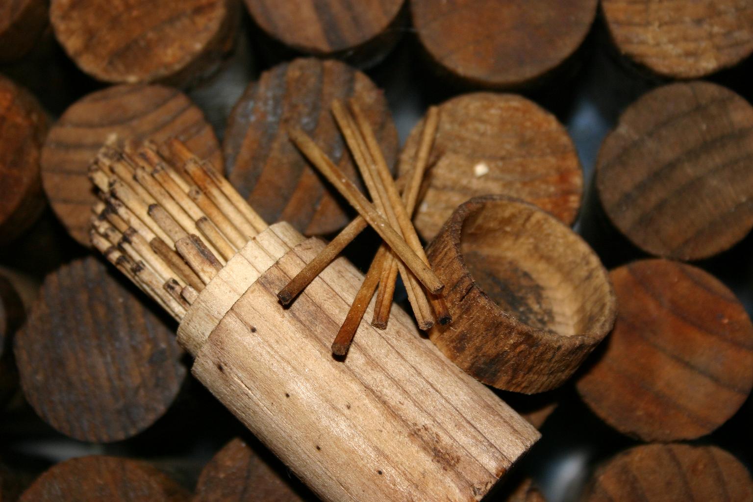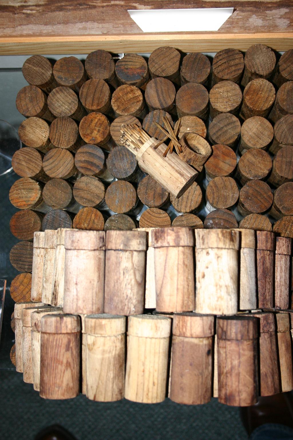 So what did at least one type of stick matches look like and how were they packaged? These below have the phosphorous tips disolved away, but you'll get the idea. The wooden containers were about two inches in diameter. They varied a little which was from being waterlogged and then shrinkage. Dave and I looked under the cap to see if there was a rough place, i.e. glued sand paper, but we found nothing but a dark spot. Couldn't tell if it was discolorization from the phosphorous tips, where glue had been or simply age. So who's going to tackle making these now?