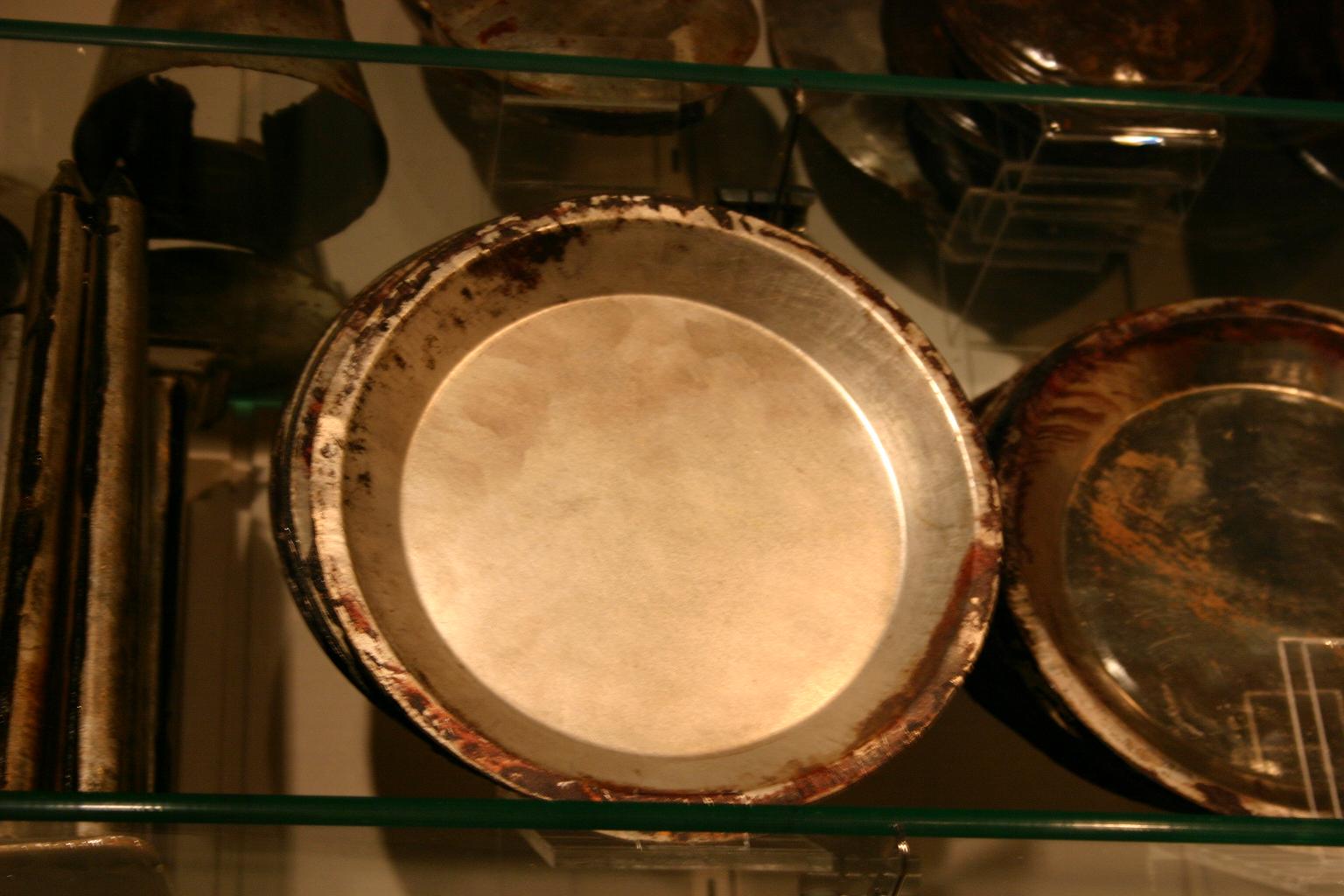 I've heard people say that a stamped/pressed tin plate that looks like a modern tin pie plate is not correct. I say look at the picture of the one below. There were quite a few on display, and Dave got this one down for me to see the back side. The edges were simply folded under and pressed flat about 2-3 mm. What do you think about that?