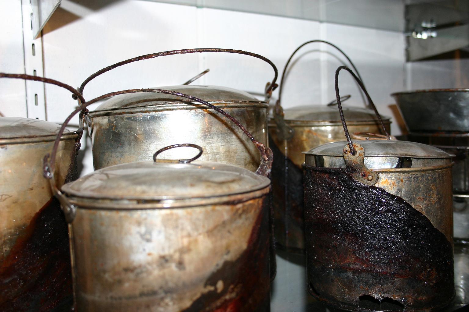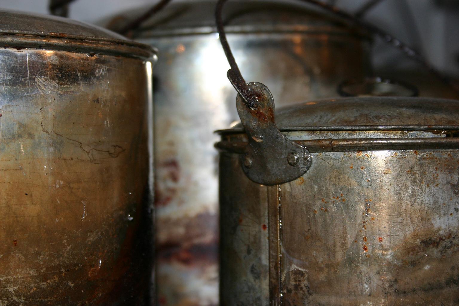 I've heard some people say that you should really have cast iron ears for the bail on boilers. While I did see cast iron ears on a boiler in another museum, all the ones I saw at the Arabia were of tin. Some were plain and simply curved. Others had a stamped groove around the hole through which the bail wire went. The ears were all riveted to the body of the boiler. Some photos are below. What do you think about that?