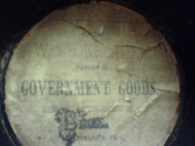 The label inside is not the original. The current one identifies the cap as a surplus provided by W Stokes Kirk of Philadelphia. I know that this guy sold a lot of army surplus starting after the war in the late 19th century. Kaelin, I'll shoot it over to Billy and see what he thinks.