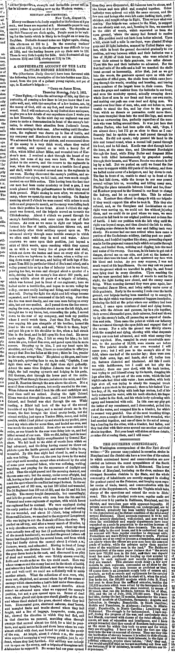 While surfing through "Nineteenth Century British Newspapers" today, I found the attached letter, which originally appeared in the Charleston SC "Daily Courier"--probably in mid-July 1862--and was subsequently reprinted in the 25 August 1862 Glasgow (Scotland) "Daily Herald."