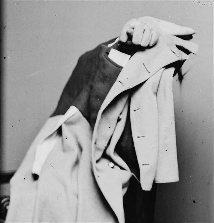 Draped over the chair to the left of the image is his great coat, and thanks to the way it falls over the back of the chair, you can make out some details of the interior. Note the dark lining, possibly (or maybe quite probably) red flannel, both inside the coat and underneath the cape, as well as the interior breast pocket.