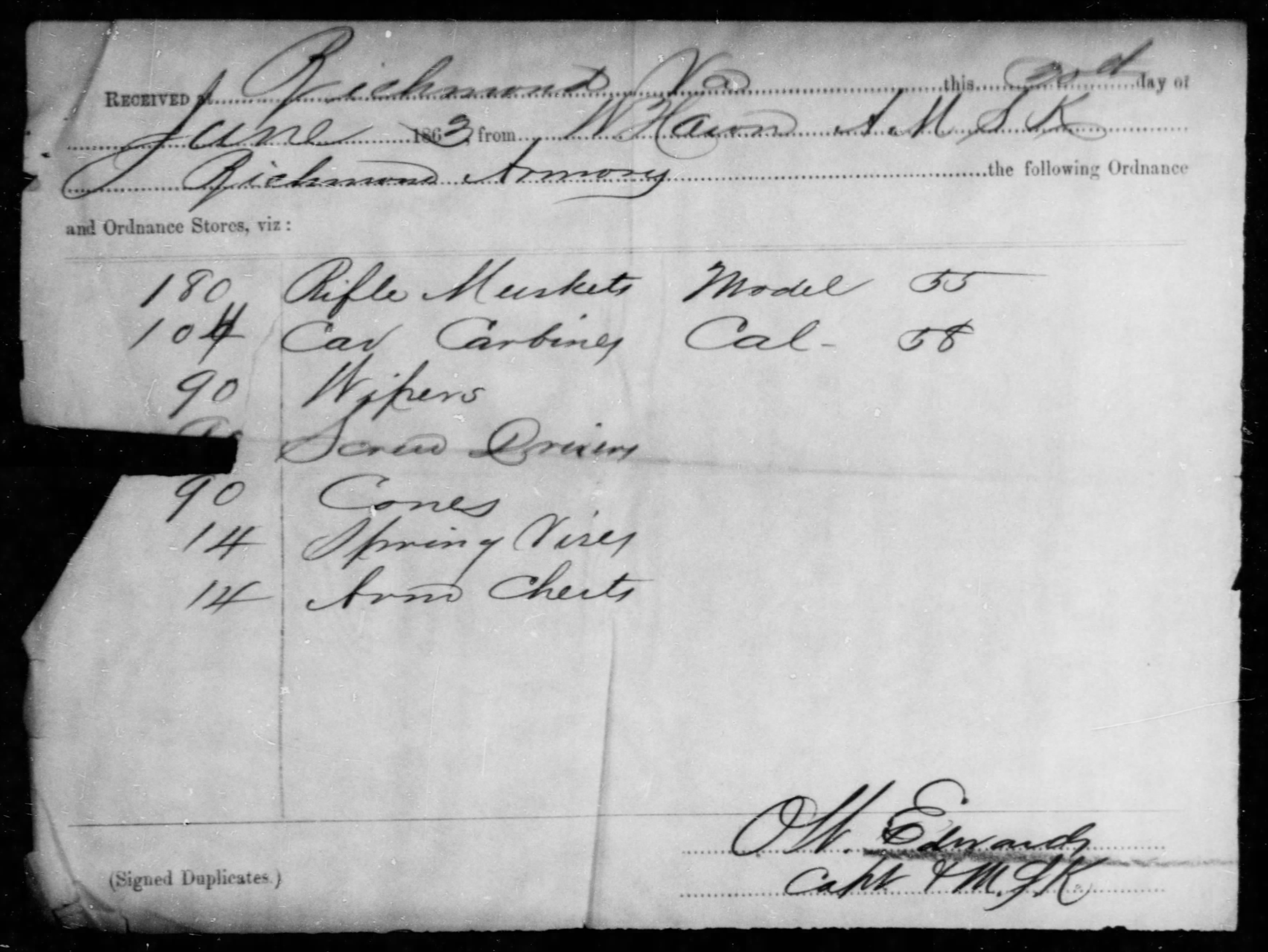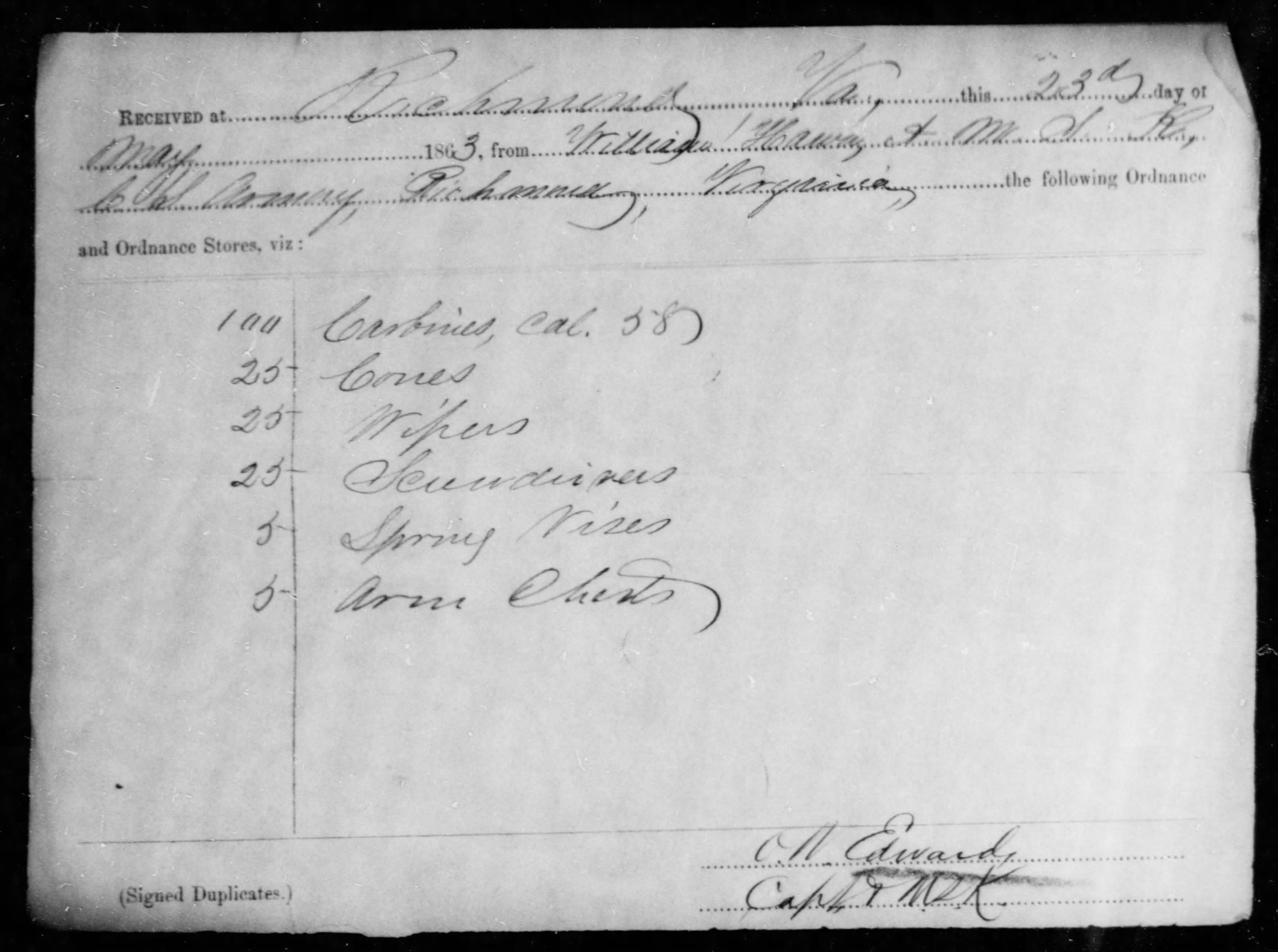 I have been going through O. W. Edwards records from the Richmond Ordnance Bur. and have come up with a question or maybe confusion of identifying carbines coming to the Bureau from the armory. I have found several invoices with in months of each other which I will attach to the this post. The carbines are listed as the following: