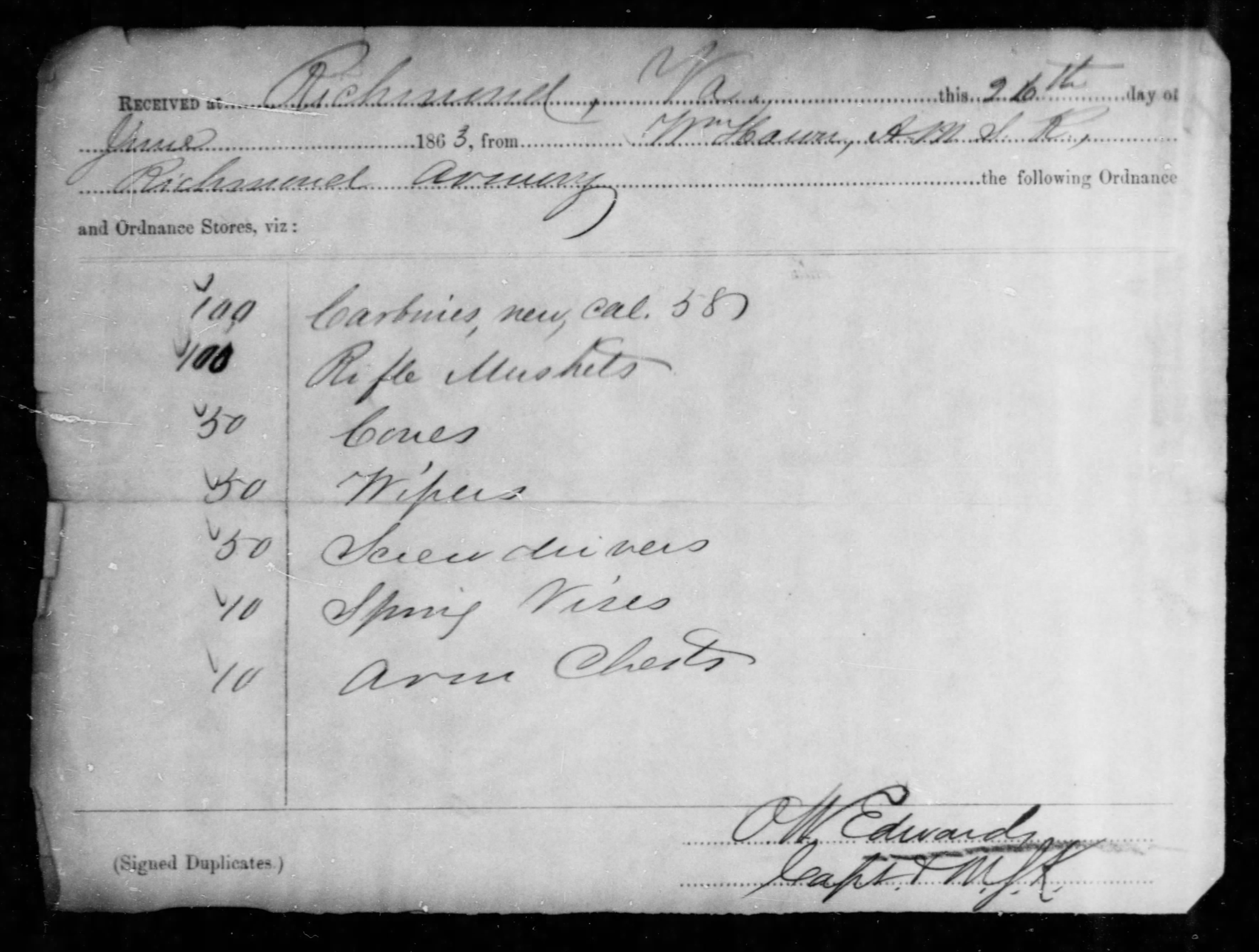 These are all records coming from the Richmond Armory to the Richmond Ordnance Bureau and carbines are not listed as any other name. For instance, I have seen records for Sharps, Enfield, Bilharz Hall, and Co. etc. My first question, is it safe to assume that because they are not named, they are the Richmond muzzle loading carbine produced using the Harpers Ferry equipment? Second question, does anyone know the difference to the gun that would give it a different name? Or was this just a mistake of someone filling out the invoice.