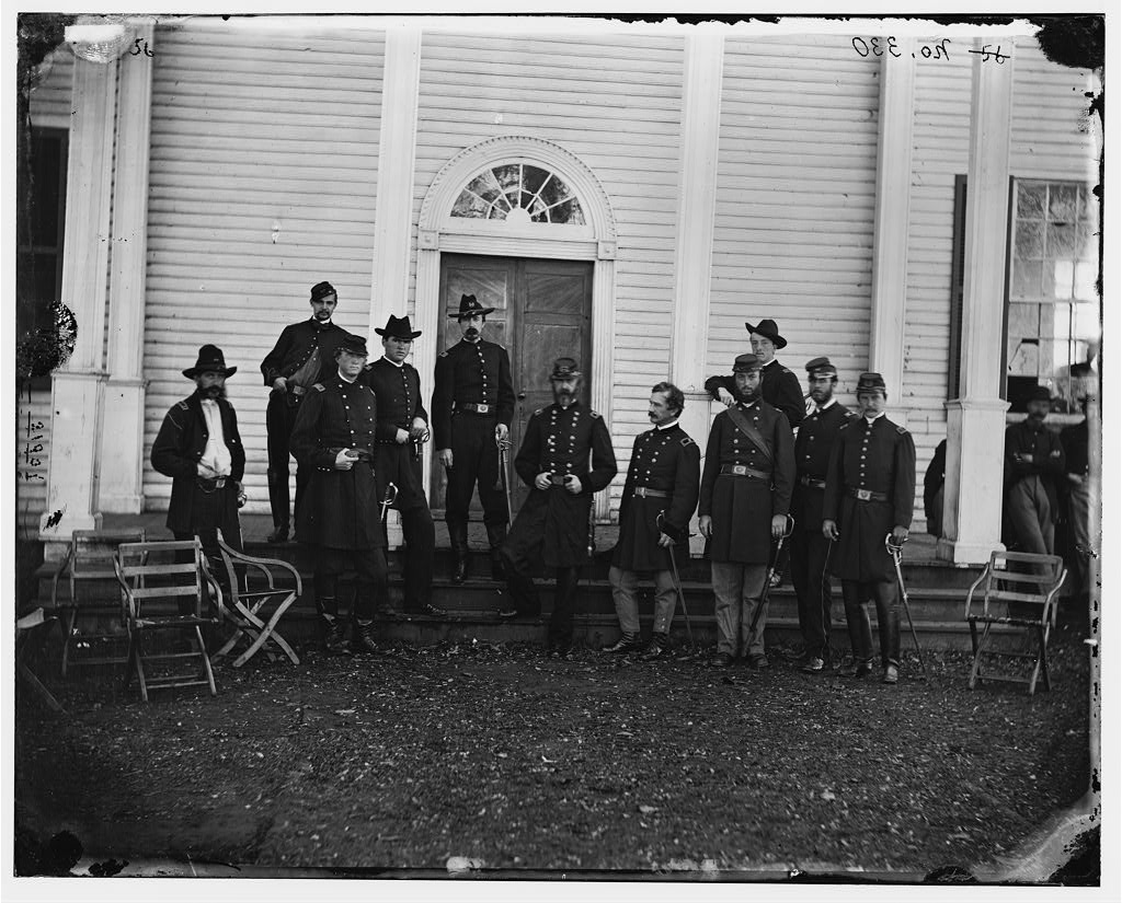 Aides de camp to Gen. Joseph Hooker: Capts. William L. Candler, Harry Russell, and Alexander Moore, more staff types, one with Cav sword.