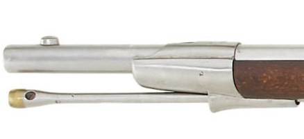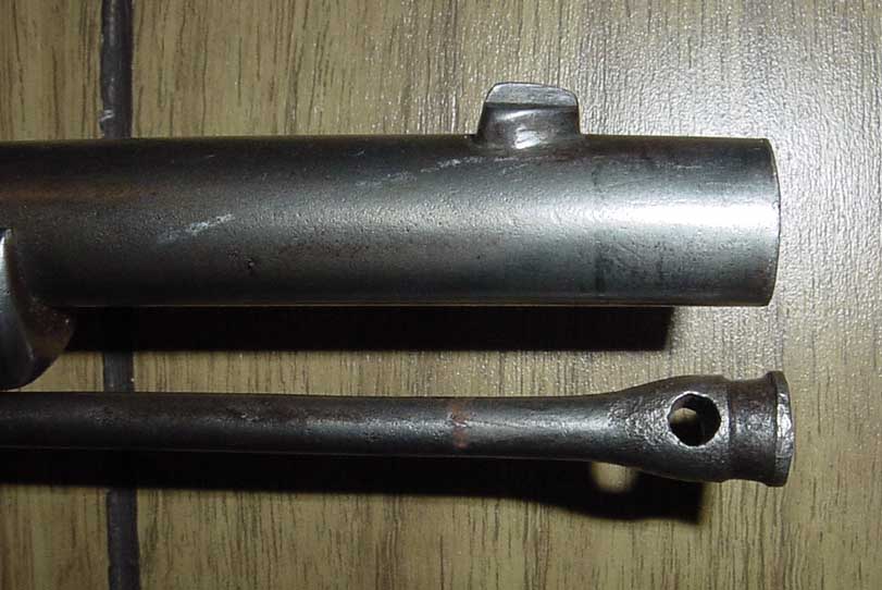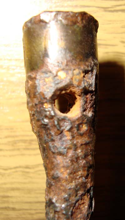 The non-dug rammer is missing the brass ring but you can see the torque hole and the channel where the ring is supposed to be. It does exhibit some hammering on the end where it has been dropped into the barrel through the years. It also drops into the barrel with more than adequate clearence in the bore.