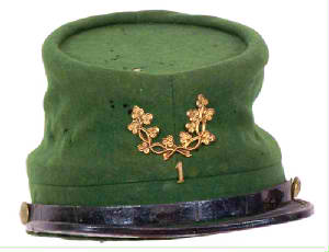 The reason I ask is because I know of a possible uniform which may be an early 1st Irish jacket and kepi. The kepi matches the one in the pictures 100% except no wreath, 1, or buttons. The construction is identical. It is worn whereas the jacket shows minimal wear. The jacket is very well tailored and the fabric matches the kepi and the two items were found together. The jacket has no buttons which leads me to believe when they stopped using the green jackets, the buttons were put on the blue coat.