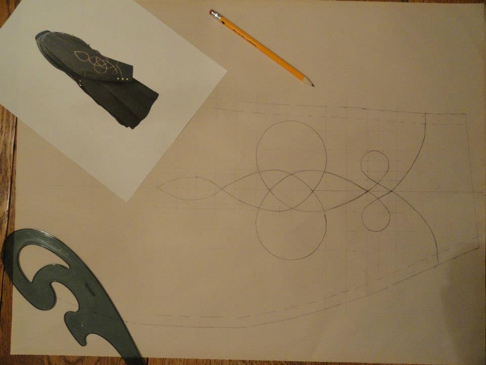 I used plain paper and photographs of some Charleston frocks to design the knots that I wanted to use. I used clear rulers, a square, and a set of French curves to draft the pattern.
