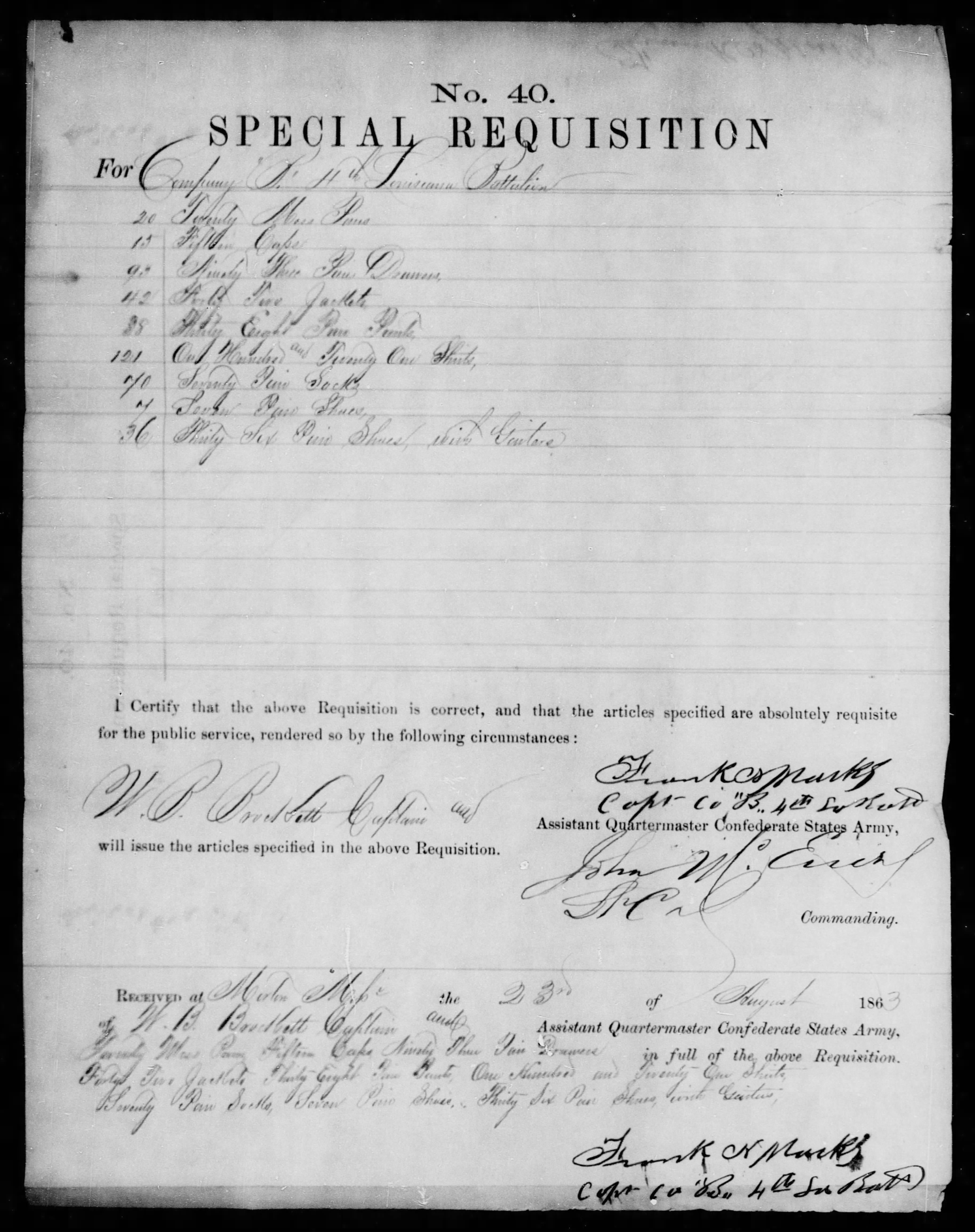 Example 1 comes from the 4th Louisiana Battalion in late August 1863. At the time they were stationed in east central Mississippi, but within a few days they would be heading out to Georgia to reinforce the Army of Tennessee. I have provided one example from Co. "B", the other companies got roughly the same things.