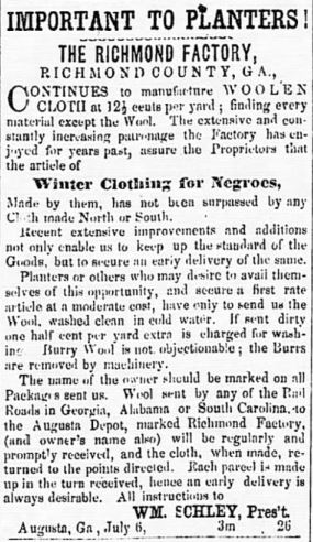 I understand there was also a State of Georgia clothing manufactory at Augusta as well. That was a different establishment from the CS Army Clothing Bureau establishment at Augusta. There are some specific references to the GA state issue clothing being "dingy" white goods if I recollect. I believe there is reference to it in Mr. Arliskas' "Cadet Gray and Butternut Brown." As noted in one of the earlier posts, the "Richmond" reference from the Savannah Quartermaster Documents reference likely refers to Augusta goods. The "Richmond Factory" was a large facility which made Negro cloth (plains and kerseys) for slave clothing before and during the War: