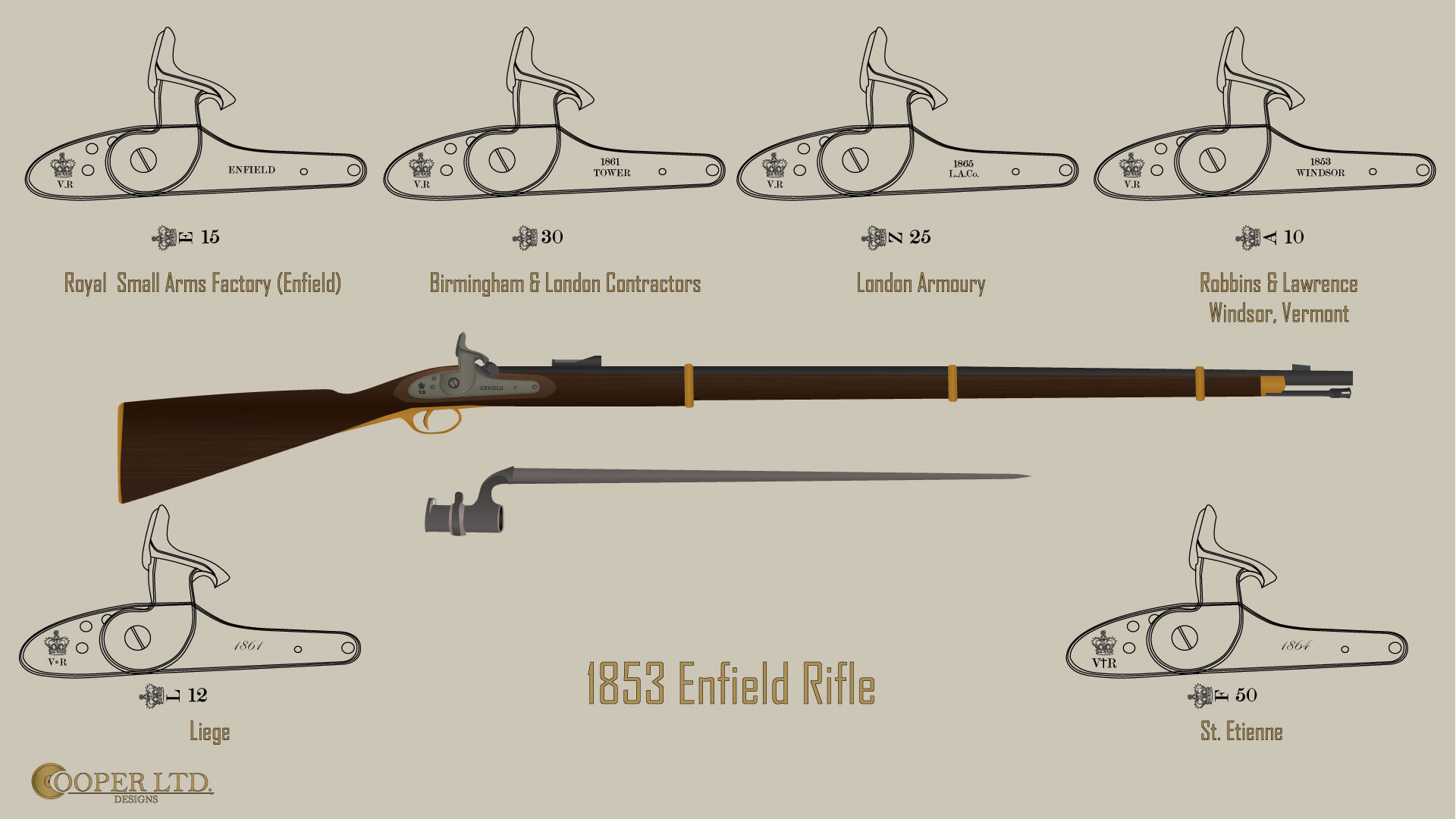 Hi guys, I'm a fellow reenactor but I also work on illustrations. I was trying to figure out all of the P1853 Enfield manufacturers so I can make the image below. Am i missing any manufactures? any help would be appreciative
