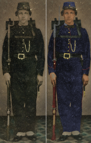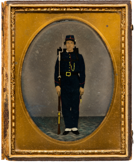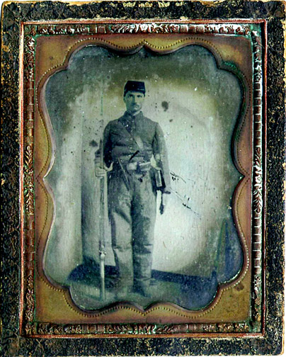 I have two photos of the Orleans Guard, though they are drastically different. One appears in the uniform described by the New Orleans Daily Crescent, while the other appears to be wearing lighter trousers.