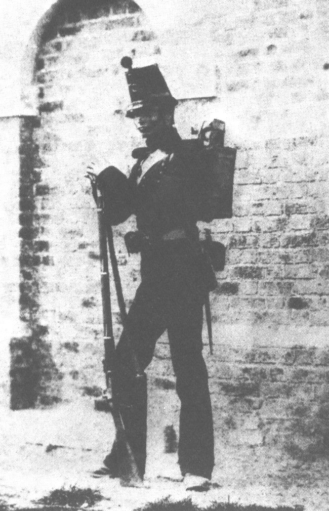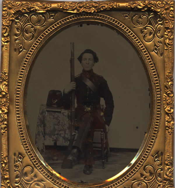 The image shows a fully equipped US soldier (more than likely a member of the 6th or 44th Mass) with all English accouterments. He sports the classic snake buckle belt, the "Enfield" bayonet scabbard and frog (note that the frog has the strap), the wide cartridge sling for an Enfield cartridge box and an Enfield rifle-musket with sling. He is wearing what appears to be a non-regulation dress coat with epaulettes. His trousers have a double contrasting color stripe on them as well. His shako with infantry hunting horn is on the table next to him. I'm not horribly up on which Mass units were issued what types of uniforms, but I'm assuming the combination of the striped trousers, special frock and the shako will make one of you guys say, "I know what unit that is!"