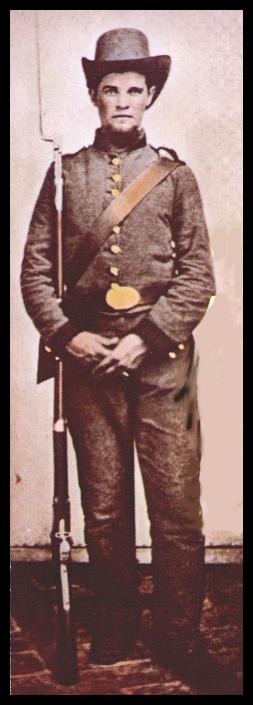 I have always thought felt that this coat is a commutaion jacket-he writes about receiving a matching jacket, trousers and vest from home-it looks to me as if the trousers could match the jacket. As far as the collar, it looks like it has 2 hook and loop type fasteners at the collar and he has the top one fastened, the bottom open-as well as having an angled line of trim(possibly black) on each side of the collar. The buttons have always looked oversized to me, they are rounded on top and appear to have some design or stamp on them-maybe a greatcoat button? I have also wondered if maybe this was a frockcoat. His hat is also interesting, the AOT didnt have a whole lot of oppurtunity to capture Federal gear, a souvineered Hardee, would have certainly been a status symbol, but how likely?-possibly a confederate produced "Hardee"? Sorry that I have more questions than solutions-just some food for thought.-ELI GEERY