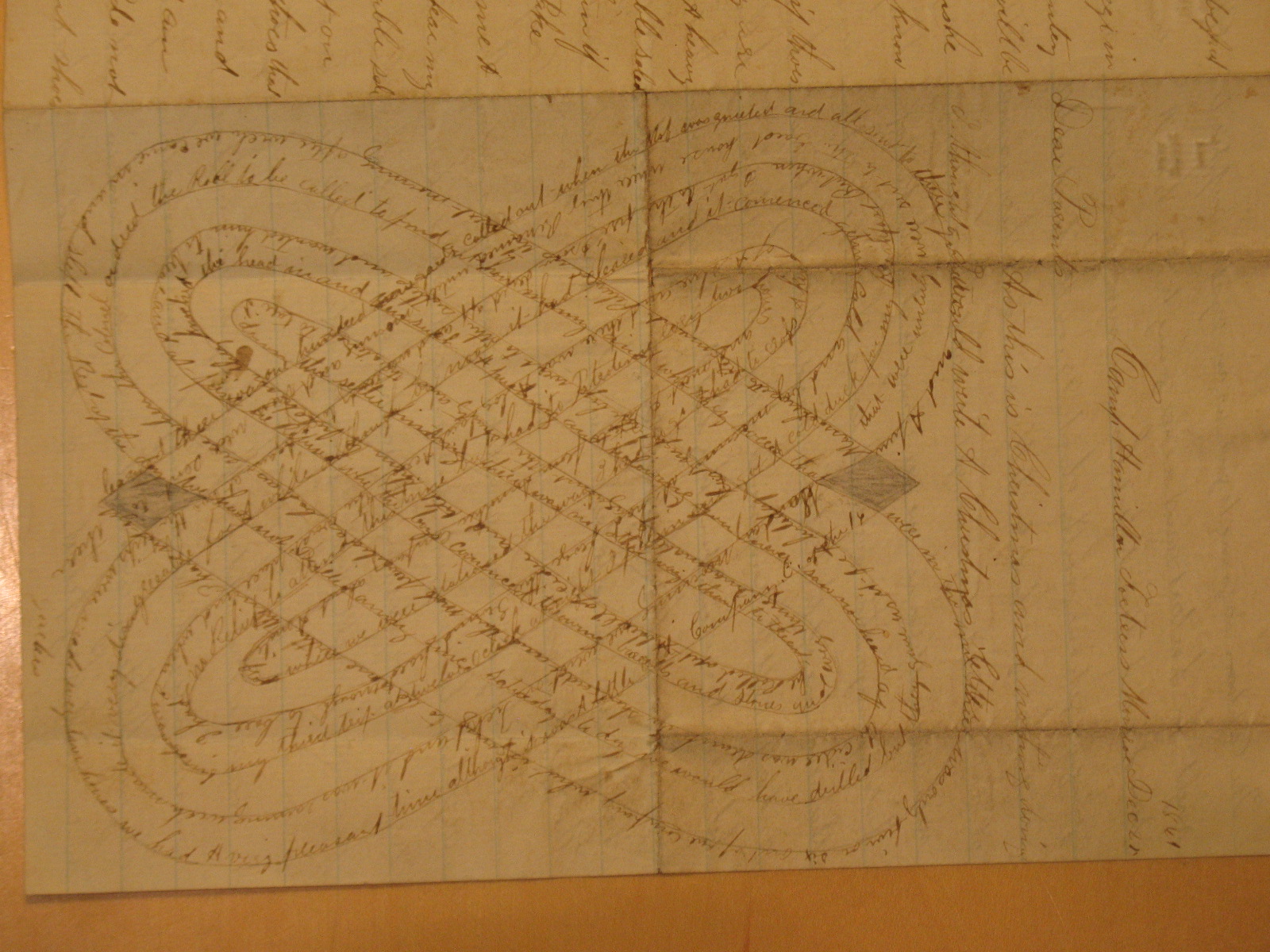 I didn't have any luck when searching the forum, but hopefully you all can help me: I have read/heard many times about soldiers writing "criss cross" letters, that is, writing part of a letter on a piece of paper then giving the page a quarter turn and writing the rest of the letter on the same page with the lines perpendicular to and crossing through each other. Does anyone have or has anyone seen images of original letters written this way? I would like to have one such example of this to show students when I do programs and talks. I considered trying to do one myself, but my grade school cursive is a sorry substitute for 1860s handwriting. If anyone has an image they can share, please let me know.